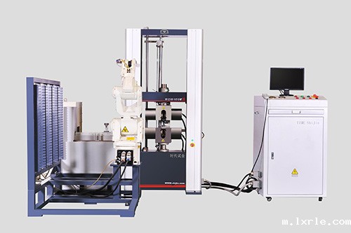 全自动材料拉伸试验机是目前最为先进的自动化试验系统,它可在无人值守的情况下,连续完成批量材料试样的自动送样、自动装夹、尺寸的自动测量、试验数据的自动测量及记录、试验数据自动分析及上传、自动检测各种状态并自动处理各种异常等功能。可不间断、高精度地完成批量试样的材料力学性能测试,实现无人值守完成大批量试验的全自动试验过程。整机由机器人、电子式拉力试验机、横截面尺寸测量平台、全自动引伸计、对夹式平推夹具、试样架、控制系统、管理及测控软件等构成,为安全、高效地完成大批量材料力学性能测试提供可靠的解决方案。 整机已申报专利8项,其中发明专利3项,新型及外观专利5项。整机通过机械、电气控制、软件检测处理等手段,着重考虑可靠性,无论在适应能力、容错性方面都具有测控系统自动响应或报错功能。 拥有自主知识产权,自主开发全部的测控系统及软件,设计合理高效的全自动试验流程,具有功能完善的数据处理与上传系统。整体管理软件和试验软件一体化,包括机器人、尺寸测量平台、PLC、平推夹具、全自动引伸计、伺服电机、绝对编码器、防护门的检测与综合协调控制,实现了试样信息录入与优先插入、检测、管理,试验数据自动检测保存与处理,以及各部件状态监测和各种异常自动处理等功能,可真正适用于实际工业应用。 多关节型机器人主要完成试样的抓取、送样、装夹及废料的回收。该机器人运行过程中最大线速度可到1M/s,最大程度保证了试验效率。机器人末端夹爪具有试样自动检测的功能,可自动检测试样是否稳固夹持,并通知控制系统。 试样尺寸测量平台,主要完成试样横截面尺寸的自动测量,在管理软件的控制下,可判断并可通过量块进行自我校准,保证了尺寸数据的准确性,数据自动传入计算机系统,完成试样信息的录入。试样的尺寸测量采用配合楔形面及两段对称夹持,既可以确保能顺利完成挠度试样的测试,又利于保证测试精度。最大可容纳10mm挠度试样测试,测量精度满足微米精密测量的需要。 为安全考虑,系统外围设计有防护围栏,并配备防护门开关。且防护门的开合可控制机器人的暂停或试验继续。 配于驱动加载测力系统的对夹式平推夹具,在软件的控制下,可完成试样的自动夹紧和松开,且对试样的夹持力可通过试验软件自动调节。采用机械同步技术的对夹式平推夹具,拥有2.13%的同轴度,最大程度的保证了试验机的加力轴线与试样中心线的重合。