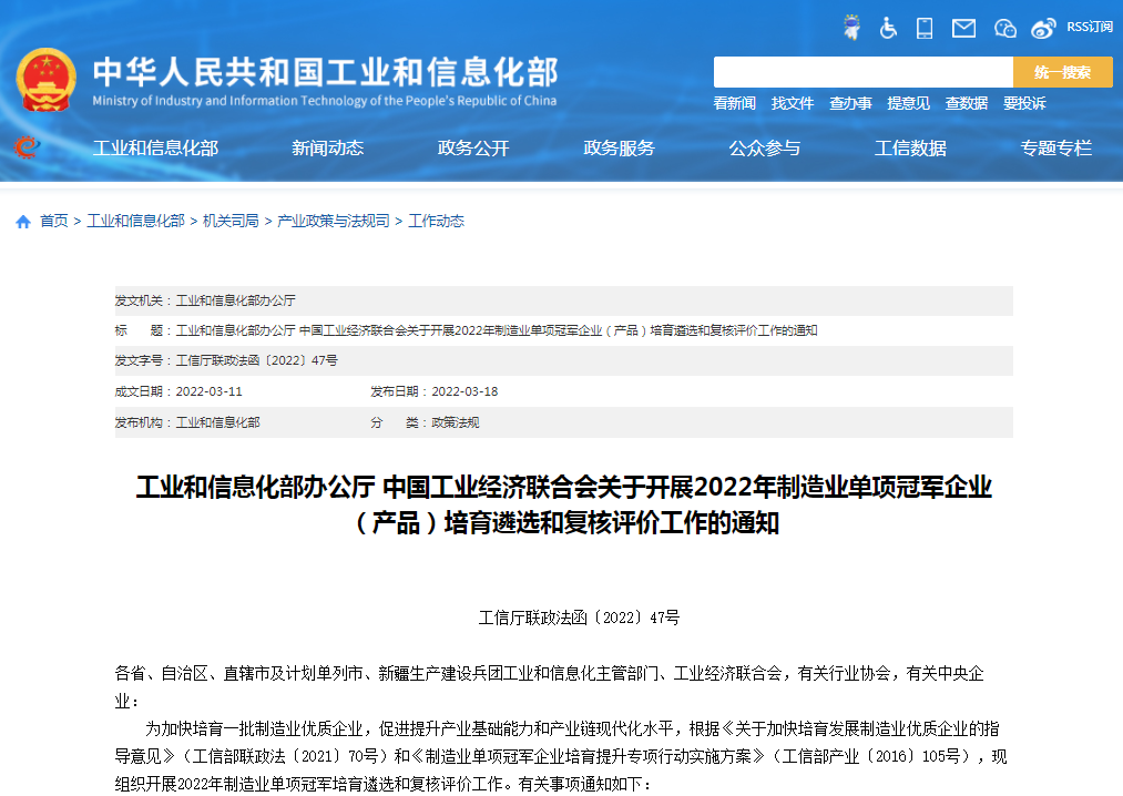 为加快培育一批制造业优质企业,促进提升产业基础能力和产业链现代化水平,根据《关于加快培育发展制造业优质企业的指导意见》(工信部联政法〔2021〕70号)和《制造业单项冠军企业培育提升专项行动实施方案》(工信部产业〔2016〕105号),现组织开展2022年制造业单项冠军培育遴选和复核评价工作。有关事项通知如下: